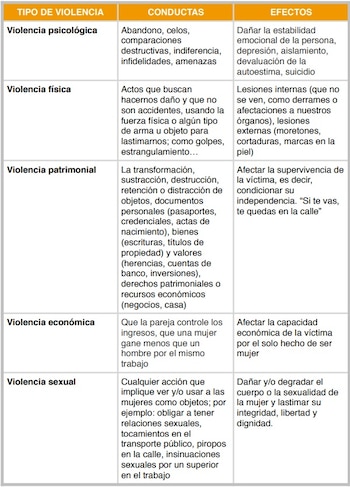 Esta ley define por primera vez los tipos de violencia en física, psicológica, económica, patrimonial y sexual; con la finalidad de mostrar que muchas veces la violencia no se ve, es decir, puede darse mediante acciones como controlar el gasto, amenazar a la pareja, obligarla a hacer cosas que no quiere, etcétera.
