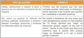 Algunos ejemplos son: que las mujeres no puedan ser candidatas para puestos públicos. Que las mujeres no puedan participar en las asambleas de los pueblos para decidir cómo se van a usar los recursos. Que a las mujeres se les prohíba salir después de ciertas horas o que no puedan estar solas en la calle.