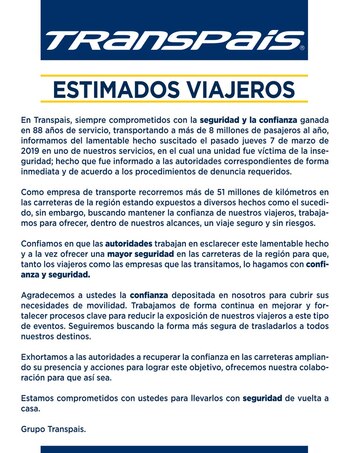 La empresa de transporte en la que viajaban los secuestrados hizo un llamado al gobierno a garantizar la seguridad en las carreteras e imponer el estado de derecho.