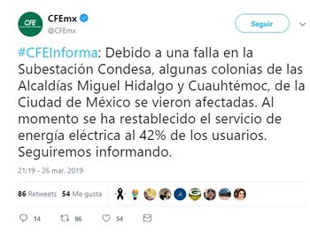 "Debido a una falla en la Subestación Condesa, algunas colonias de las Alcaldías Miguel Hidalgo y Cuauhtémoc, de la Ciudad de México se vieron afectadas. Al momento se ha restablecido el servicio de energía eléctrica al 42% de los usuarios. Seguiremos informando".