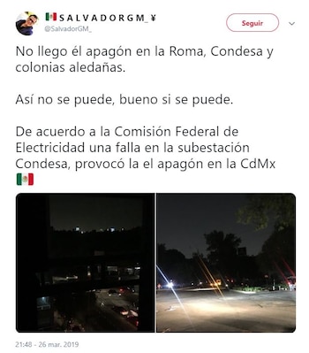 Por apagón en la Roma- Condesa, CFE indica que se debió a una falla en la Subestación Condesa, colonias de las Alcaldías Miguel Hidalgo y Cuauhtémoc fueron afectadas. Servicio de energía eléctrica restablecido al 42%. –Actualizado 9:52pm 26/03/19 pic.twitter.com/D9VrfRQzr9