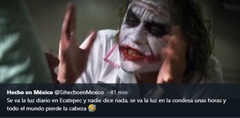 "¿Ya somos oficialmente Venezuela? ¿Qué pedo con el mega apagón Roma-Condesa??? No sirven los semáforos, esto es tierra de nadie!", escribió una usuaria, haciendo referencia a las comparaciones que hacían algunos sectores de la población durante el periodo electoral, sobre las supuestas consecuencias de que Andrés Manuel López Obrador llegara a la presidencia de México.