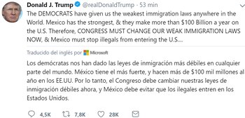 El presidente republicano aseguró que: "Los demócratas nos han dado las leyes de inmigración más débiles que en cualquier parte del mundo. México tiene las más fuertes, y genera más de $100.000 millones al año por parte en los EEUU. Por lo tanto, el Congreso debe cambiar ahora nuestras débiles leyes de inmigración y México debe evitar que los ilegales entren a los Estados Unidos".
