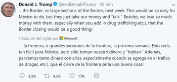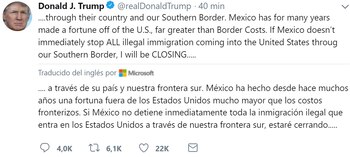 Este viernes el presidente estadounidense Donald Trump escribió en su cuenta de Twitter que: "si México no detiene inmediatamente toda la inmigración ilegal que entra en los Estados Unidos a través de nuestra frontera sur, estaré cerrando la frontera, o grandes secciones de la frontera, la próxima semana".