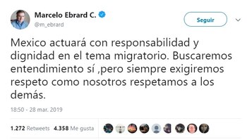 "México actuará con responsabilidad y dignidad en el tema migratorio. Buscaremos entendimiento sí, pero siempre exigiremos respeto como nosotros respetamos a los demás", escribió la noche de jueves el titular de la Secretaría de Relaciones Exteriores.