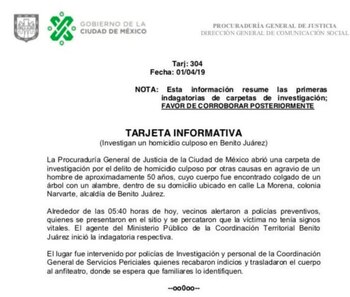 A través de una tarjeta informativa, la PGJ detalló que el cuerpo del músico fue encontrado colgando de un árbol con un alambre afuera de su domicilio en la colonia Narvarte, en la alcaldía Benito Juárez.