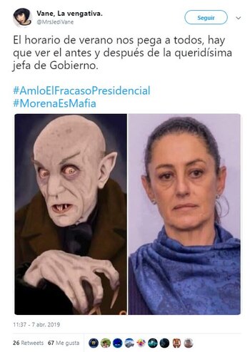 Alguien publicó la foto de Claudia Sheinbaum, jefa de gobierno de Ciudad de México, junto a un vampiro. "El horario de verano nos pega a todos".