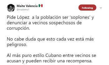 Las críticas más fuertes se hicieron en Twitter, donde la usuaria @maitemx1 publicó el extracto del video con la declaración de AMLO, acompañado del comentario "al más puro estilo Cubano entre vecinos se acusan y pueden recibir una recompensa".