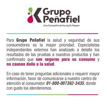 En tanto, Peñafiel, que es propiedad de la empresa Keuring Dr. Pepper, a través de su directora de comunicación, Katie Gilroy Kariela, reconoció que después de una serie de pruebas pudieron confirmar la existencia de niveles elevados de arsénico en el agua mineral, según dijo el periódico Reforma, aunque hoy por la tarde, la empresa afirmó en un comunicado que estudios externos confirmaron que sus productos no eran nocivos para la salud.