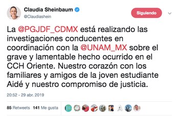 "La @PGJDF_CDMX está realizando las investigaciones conducentes en coordinación con la @UNAM_MX sobre el grave y lamentable hecho ocurrido en el CCH Oriente. Nuestro corazón con los familiares y amigos de la joven estudiante Aidé y nuestro compromiso de justicia", escribió Sheinbaum.