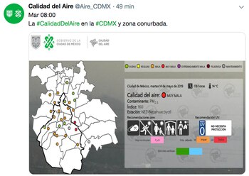 En el reporte de las 8:00 horas, la Dirección de Monitoreo Atmosférico explicó que se registra una muy mala calidad del aire, siendo la estación Nezahualcóyotl la que cuenta con la mayor cantidad de puntos de contaminantes del Valle de México (160).