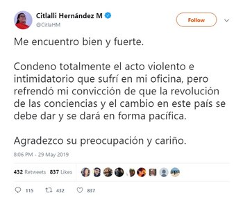 Por su parte, la senadora militante del Partido Revolucionario Institucional (PRI), Vanessa Rubio Márquez, externó su solidaridad a su compañera y catalogó de "reprobable e inaceptable" el atentado del que fue objeto.