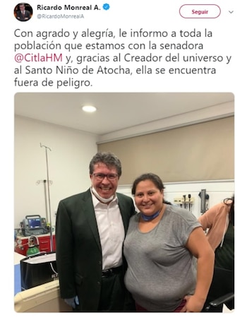 A través de su cuenta de Twitter, Monreal aseguró que su compañera de partido se encuentran fuera de peligro.