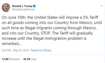 "El 10 de junio, los Estados Unidos impondrán un arancel 5% a todos los bienes que entran en nuestro país desde México, hasta el momento en que los migrantes ilegales que llegan a través de México paren. La tarifa aumentará gradualmente hasta que se solucione el problema de la inmigración ilegal", anunció Trump en Twitter y afirmó que la cifra del arancel se incrementará gradualmente mientras México no tome medidas en materia migratoria.