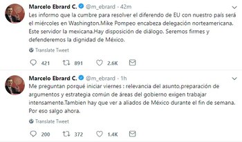 A través de su cuenta de Twitter @m_ebrard, indicó que él encabezará a la delegación mexicana, mientras que su homólogo Mike Pompeo estará al frente de la estadounidense.