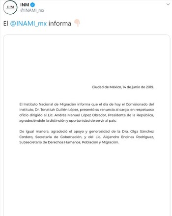 El comisonado del Instituto Nacional de Migración (INM), Tonatiuh Guillén López, presentó este viernes su renuncia al presidente Andrés Manuel López Obrador, sin precisar los motivos de su dimisión al puesto.