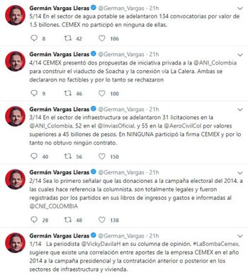Ante esta nueva información, el ex presidente de Colombia, Germán Vargas, negó que exista una correlación entre aportes de la empresa Cemex en el año 2014 a la campaña presidencial, y la contratación anterior o posterior en los sectores de infraestructura y vivienda.
