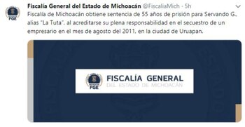 Las autoridades confirmaron que el Supremo Tribunal de Justicia del Estado (STJE) condenó a "La Tuta" por un secuestro que se llevó a cabo en Uruapan, en agosto de 2011.