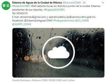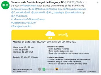 La Secretaría de Gestión Integral de Riesgos y Protección Civil activó la alerta amarilla por avance de tormenta en las alcaldías de Azcapotzalco, Benito Juárez, Coyoacán, Cuauhtémoc, Gustavo Amadero, Iztacalco, Iztapalapa, Venustiano Carranza y Miguel Hidalgo.