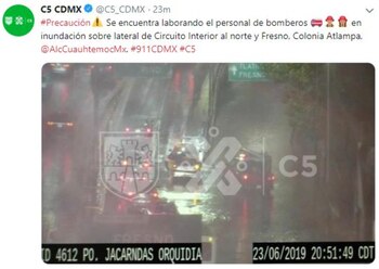 Personal de bomberos se encuentra trabajando en inundación sobre lateral de Circuito Interior al norte y Fresno, colonia Atlampa, en la Cuauhtémoc. A su vez, el Sistema de Aguas de la Ciudad puso a disposición de la ciudadanía su teléfono de contacto en caso de cualquier incidente.