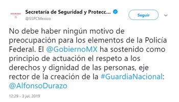 Alfonso Durazo, Secretario de Seguridad y Protección Ciudadana del gobierno federal, aseguró que los elementos de la Policía Federal (PF) que serán enviados a la Guardia Nacional (GN) no deben temer por sus prestaciones, sus derechos ni su dignidad, luego del paro que realizaron efectivos inconformes con su transferencia a la nueva corporación.