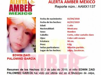 El pasado miércoles 3 de julio por la tarde, la Fiscalía General de Justicia del Estado de Zacatecas (FGJEZ), recibió una denuncia de desaparición de un menor de un año de edad, identificado como Edwin Zaid Palomino García, originario de Jalpa, de quien hasta el momento se desconoce su ubicación, por lo que se procedió a emitir una Alerta Amber y lograr su localización.