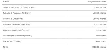 En el centro de la disputa con empresas como TC Energy Corp. de Canadá, están contratos del tipo "tomar o pagar" firmados con el gobierno anterior que vio cómo la estatal de servicios de energía de México pagó por un gas que nunca se entregó. La Comisión Federal de Electricidad, conocida localmente como CFE, está considerando aproximadamente US$3.000 millones en arbitraje para cuatro de los siete contratos de ductos en juego.