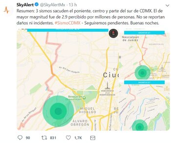 "Los días 12, 13, 14 y 16 de julio de 2019, el Servicio Sismológico Nacional (SSN) de la Universidad Nacional Autónoma de México (UNAM) reportó ocho sismos que fueron localizados en la demarcación territorial de las alcaldías Miguel Hidalgo y Álvaro Obregón, en la Ciudad de México", dice un reporte del Sismológico que fue actualizado por última vez la mañana del martes y que no registra los tres sismos de esta noche.