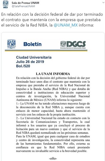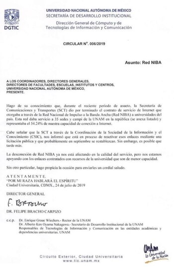 En redes sociales maestros, investigadores y trabajadores de la UNAM compartieron un memorándum de la Dirección General de Cómputo y de Tecnologías de Información y Comunicación de la Máxima Casa de Estudios, donde se informó que este viernes y que durante el reciente periodo de asueto "la Secretaría de Comunicaciones y Transportes dio por terminado el contrato de servicio de Internet que otorgaba a través de la Red Nacional. De Impulso a la Banda Ancha (RED NIBA) a universidades del país".