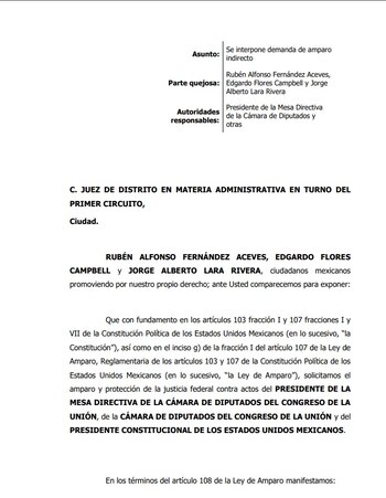 La demanda de amparo fue presentada el miércoles 31 de julio ante la oficialía de partes de juzgados de distrito en materia administrativa y deberá ser admitida a trámite.