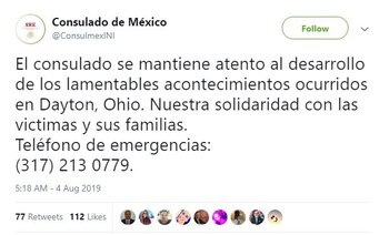 En otro tuit, Ebrard también informó que durante la madrugada ocurrió un segundo tiroteo, que tuvo lugar en Dayton, Ohio. Detalló que el cónsul en Indianápolis, Luis Enrique Franco, informó que por ahora no hay mexicanos entre los afectados.