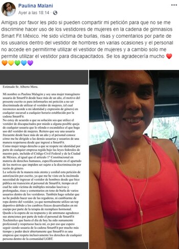 "Mi nombre es Paulina Malagón y soy una mujer transgénero usuaria de SmartFit desde hace más de un año. El motivo de mi presente escrito es para informales mi petición a no ser discriminada y pueda utilizar el vestidor de mujeres (el cual reconozco acorde a mi identidad y expresión de género) en cualquier sucursal a cualquier horario establecido por la cadena SmartFit", señaló la denunciante.