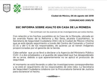 Jesús Orta Martínez, titular de la Secretaría de Seguridad Ciudadana, indicó en un primer momento que tres personas armadas ingresaron al lugar frente a la Glorieta de la Palma, despojaron de su arma al guardia de seguridad privada y posteriormente se dirigieron a la bóveda, que estaba abierta, de donde sustrajeron los objetos.