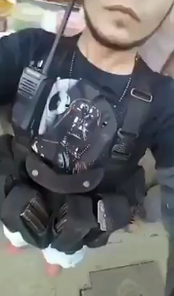 En la grabación se observa a un hombre que porta armas, cargadores y un radio que muestra el puesto en donde están comiendo.