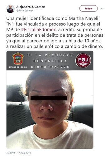 De acuerdo con las autoridades, el pasado 10 de febrero Martha Nayeli obligó a su hija a bailar ante dos sujetos, quienes le realizaron tocamientos y luego le entregaron a Martha Nayeli una suma de dinero.