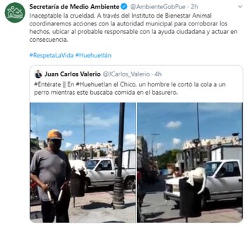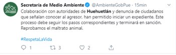Por otro lado, la Secretaría de Medio Ambiente de Puebla calificó el hecho como inaceptable y señaló que mediante el Instituto de Bienestar Animal corroborará los hechos, para ubicar al responsable y actuar en consecuencia.