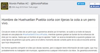 "Circula en redes el vídeo de un perro que, suponemos atraído por él hambre, se subió a un bote de basura ubicado en una plaza de #HuehuetlanElChico #Puebla. Mientras quienes graban se burlan de los esfuerzos de éste por no caerse, un hombre al que le apodan 'Gallo' se acerca inicialmente a quererlo golpear con unas tijeras de jardinero que porta, pero en el último momento decide cortarle parte de la cola al inocente animal", escribió la protectora de animales.