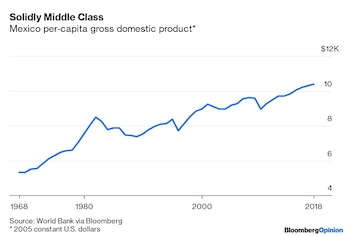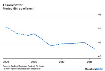 Para un país pobre, este sería un avance decepcionante. Pero si bien sigue habiendo mucha pobreza en México, el país en su conjunto ahora se encuentra firmemente dentro de los niveles de lo que el Banco Mundial llama países de ingreso mediano alto. Después de ajustar la paridad del poder adquisitivo, según el Fondo Monetario Internacional, el ingreso per cápita de México en 2018 fue de aproximadamente US$20.600, justo por delante de Argentina. Y la desigualdad, aunque sigue siendo alta, está disminuyendo: