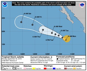 Si bien Juliette está muy lejos de las costas, "refuerza el potencial de lluvias en el occidente de México", indica el pronóstico de la institución mexicana.