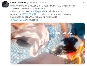 La policía capitalina descubrió una macabra escena en el interior de una vivienda en Tlalpan, al hallar a una mujer muerta en su cama y a un bebé sumergido en un bote con agua; por lo que consideran que el menor falleció ahogado.