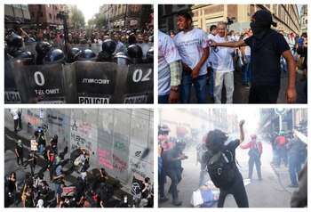 17:06 horas: En la avenida Juárez se rebasa el cinturón de seguridad y realizan pintas en edificios públicos. Algunos reporteros informan los primeros altercados con los manifestantes, luego de que estos pintaran los lentes de sus cámaras.