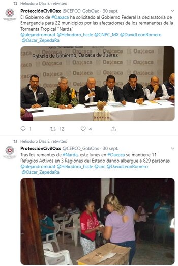 A su paso por Oaxaca, Narda dejó un muerto y más de 300 damnificados. Heliodoro Díaz Escárraga, director del organismo, señaló que en Miahuatlán un joven de 26 años de edad murió tras ser arrastrado por la corriente de un arroyo. El cuerpo fue localizado a un kilómetro de donde desapareció.