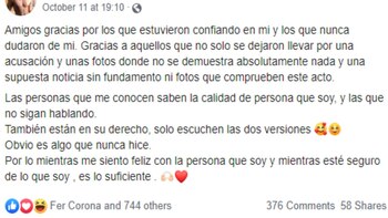 "Amigos, gracias por los que estuvieron confiando en mí y los que nunca dudaron de mí. Gracias a aquellos que no solo se dejaron llevar por una acusación y unas fotos donde no se demuestra absolutamente nada, y una supuesta noticia sin fundamento ni fotos que comprueben este acto.