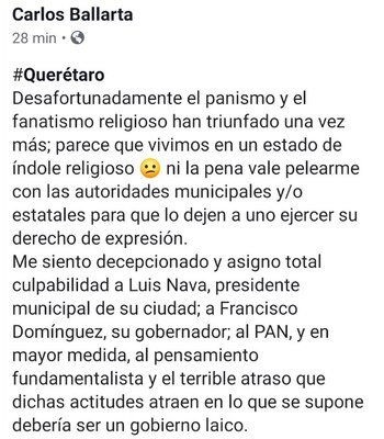 “Me siento decepcionado y asigno total culpabilidad a Luis Nava, presidente municipal de su ciudad; a Francisco Domínguez, su gobernador; al PAN y, en mayor medida, al pensamiento fundamentalista y el terrible atraso que dichas actitudes atraen a lo que se supone debería ser un gobierno laico”.
