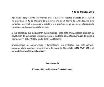 Rodham Entertainment informó que el evento “ha sido cancelado por motivos ajenos al artista y a la productora, ya que no se otorgaron los permisos municipales de dicho evento”. A partir del 21 de octubre las personas que tenían boletos podrán solicitar su reembolso en el Auditorio José María Arteaga.