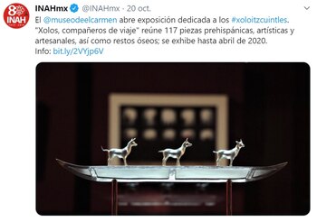En su honor y con el fin de ofrecer un panorama de las razas propias del país y destacar su importancia como parte del patrimonio biocultural de México, el Instituto Nacional de Antropología e Historia (INAH), a través del Museo de El Carmen, montó la exposición Xolos, compañeros de viaje, que reúne 117 piezas prehispánicas, artísticas y artesanales, así como restos óseos, provenientes de los acervos de más de 20 instituciones, como los museos regionales de Colima y de Guadalajara, Nacional de Antropología (MNA) y Universitario Alejandro Rangel, entre otros.