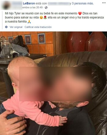 En redes sociales la abuela de Faith mostró la emotiva fotografía del reencuentro de la bebé con su padre Tyler, ambos sonriendo, en medio de inmenso dolor de perder a Christina, su madre y esposa, ambos tienen aún una esperanza de vida.