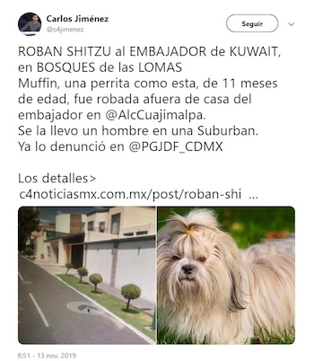 La familia del embajador de Kuwait en México, Muteb Saleh Almutoteh sufrió el robo de su mascota en la lujosa colonia Bosques de las Lomas en Ciudad de México.
