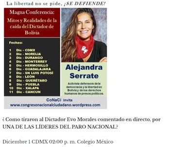 En entrevista para Infobae México explicó que al menos en dos sitios del país le han negado el uso del espacio para dar su charla, titulada “Mitos y realidades de Evo Morales, la caída de una dictadura”. Uno de estos lugares fue el Colegio de México (Colmex), una de las instituciones de educación superior más prestigiosas del país. De acuerdo con su testimonio, la noche previa al evento una funcionaria se puso en contacto con ella y con el Congreso Nacional Ciudadano (CoNaCi) para avisarles que el evento se cancelaba porque “iba en contra del presidente Andrés Manuel López Obrador”.