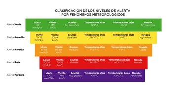 A la hora de clasificar una alerta climática, existen cinco categorías identificadas por distintos colores, y ordenadas según la intensidad y el riesgo de las condiciones meteorológicas.